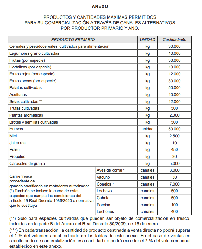 Para evitar una competencia desleal con autónomos o empresas que se centran como actividad principal en la comercialización, el decreto marca unos límites en las cantidades que el agricultor o el ganadero pueden vender. En el anexo se incluye una lista con todos los productos que pueden vender de esta forma, así como el volumen máximo permitido para cada uno de ellos.
